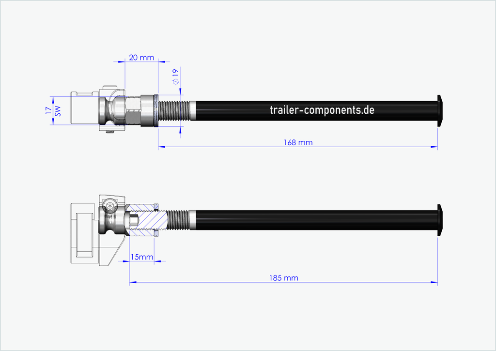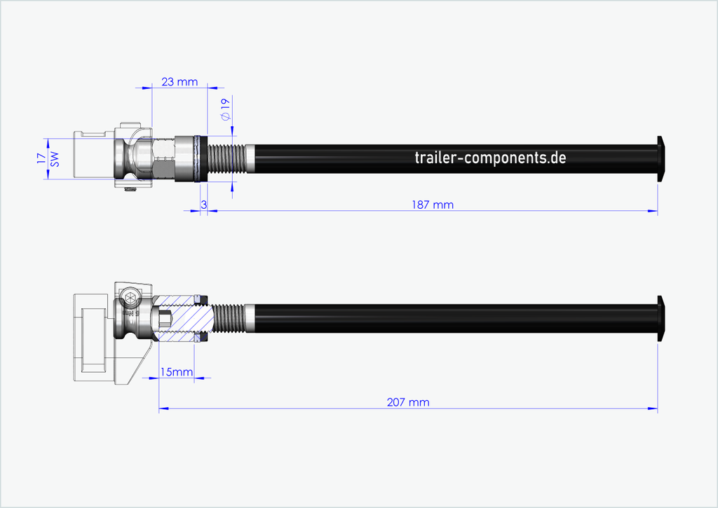 - É da sua responsabilidade determinar o tamanho correto da rosca e o comprimento de instalação [mm] do seu eixo passante atual na roda. Não tente instalar o nosso eixo passante com adaptador num tamanho de rosca diferente no cubo da sua roda traseira. Um tamanho de rosca incorreto pode danificar a sua bicicleta. Se não tiver a certeza do tamanho correto da rosca e do comprimento de instalação, contacte-nos por correio eletrónico ou telefone e teremos todo o gosto em ajudá-lo.